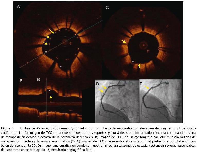 La trombosis del stent es una de las complicaciones más graves que pueden ocurrir después de la implantación del mismo. Como se ha estudiado con anterioridad, existen múltiples factores que predisponen a la trombosis. Sin ser objetivo de este trabajo, simplemente mencionaremos que dentro de esas múltiples causas se encuentran la malaposición del stent y la falta de recubrimiento del mismo por tejido endotelial. Si bien existen algunos métodos como el UIV, que puede, con mayor precisión que la angiografía, detectar sitios de malaposición, la TCO ofrece una resolución absolutamente mayor para definir la posición precisa de los soportes (struts) del stent y puede detectar grados de malaposición no visibles con otras técnicas. Por otro lado, la TCO permite visualizar tejido de recubrimiento en el stent incluso cuando este consiste en capas muy finas, como ocurre habitualmente con los stents farmacoactivos. Es importante, sin embargo, tener en cuenta que la TCO no es capaz de detectar una capa única de células endoteliales y que no puede distinguir si el tejido que recubre el stent es endotelio funcionante. En todo caso, en este momento es la mejor técnica de la que disponemos para el estudio in vivo del recubrimiento del stent. La TCO es también útil para detectar infraexpansión del stent, otro de los aspectos que se han implicado en las trombosis del mismo, especialmente las subagudas. Por tanto, es una técnica que puede proporcionar información relevante sobre las causas que llevaron a la trombosis. Esto puede tener además influencia en el tratamiento, por ejemplo en la decisión sobre el mantenimiento prolongado de la doble terapia antiplaquetaria20-22.
