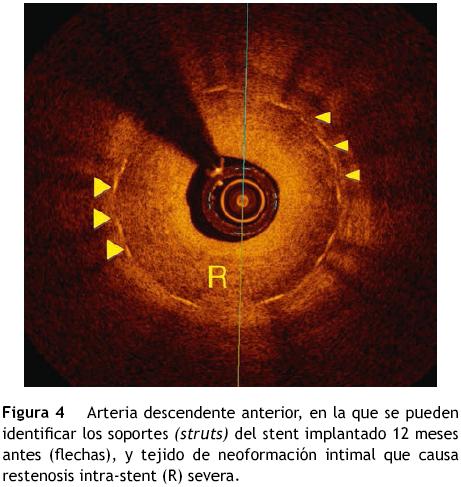La restenosis ha sido el talón de Aquiles del intervencionismo coronario desde la aparición de los stent metálicos hasta los farmacoactivos. Aunque con el advenimiento de estos últimos las tasas de restenosis han sido tan bajas como del 10%22, continúa siendo el principal motivo de la reaparición de síntomas después de la implantación de los stents. Nuevamente, el ultrasonido intracoronario ha tratado de establecer las bases en el reconocimiento de las causas y fisiopatología de la restenosis intra-stent. La TCO ha aportado nueva información en este campo, ya que las imágenes de alta resolución no solo permiten la medición exacta del tejido restenótico, sino que han revelado nuevos aspectos respecto a sus características morfológicas. Gonzalo et al.17 estudiaron a 24 pacientes (25 vasos) que presentaban datos angiográficos de restenosis intra-stent mediante análisis cuantitativo de TCO, midiendo la luz y área del stent calculando así el área de tejido restenótico. En este estudio se pudieron identificar distintos patrones de tejido restenótico (en capas, homogéneo y heterogéneo). Se logró también la visualización de microvasos de neoformación en el 12% de los casos y se pudo relacionar la forma de presentación clínica con la forma del lumen (regular o irregular) y con la presencia de material intra-luminal. Además del estudio del tejido restenótico, la TCO puede proporcionar datos sobre la causa de la restenosis (por ejemplo, infraexpansión del stent, fracturas, gaps, etcétera), aspectos que pueden ser importantes para determinar la estrategia de tratamiento (fig. 4).