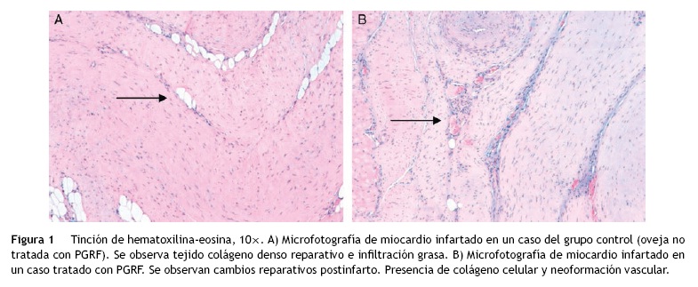 Resultados: En los corazones tratados con plasma rico en factores de crecimiento (PRGF) destaca la neoformación vascular en los cortes de hematoxilina-eosina y de factor VIII, a diferencia de los no tratados.