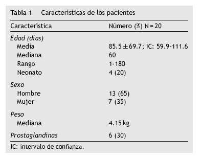 Se incluyeron 20 pacientes con CoAo (tabla 1), la media de edad fue de 85. 5 ± 69.7 días (IC 59.9-111.1, mediana de 60 y rango de 1-180), incluidos 4 neonatos (20%), de los cuales fueron del sexo masculino 13 (65%) y del sexo femenino 7 (35%) con un peso promedio de 4.15 kg. Seis pacientes (30%), incluidos los 4 neonatos, se manejaron con prostaglandinas preoperatorias (tabla 1).