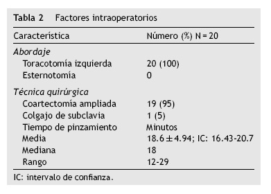 En el transoperatorio (tabla 2), a los 20 pacientes (100%) se les realizó abordaje por toracotomía izquierda, la técnica quirúrgica empleada fue coartectomía ampliada en 19 pacientes (95%), y en un paciente (5%) se realizó colgajo de subclavia con técnica Waldhausen. El tiempo de pinzamiento aórtico fue en promedio 18.6 ± 4.94min (IC: 16.43-20.7, mediana 18, rango de 12-29). En 5 pacientes (25%) se encontró hipoplasia de arco aórtico.
