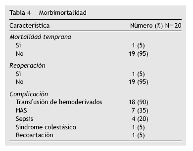 La morbimortalidad (tabla 4) en nuestros pacientes estuvo dada por un paciente (5%) que falleció por sepsis secundaria a foco neumónico, aislándose Staphylococcus aereus. Un paciente (5%) se reoperó por tener gradiente transplastia alto (50mmhg), realizando técnica de REATT. La principal causa de morbilidad posquirúrgica inmediata fue la hipertensión arterial sistémica que se presentó en 7 pacientes (35%), sepsis identificada con germen aislado en 4 pacientes (20%) y un paciente (5%) presentó síndrome colestásico. La transfusión de hemoderivados fue requerida en 18 pacientes (90%).