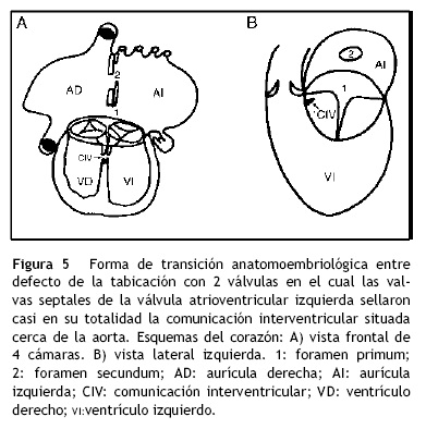 Este caso representa una forma de transición anatomoembriológica entre estos 2 tipos (la forma con 2 válvulas separadas y la forma con una válvula común), en la que las valvas septales de la válvula atrioventricular izquierda sellaron casi en su totalidad la comunicación interventricular, excepto en una pequeña zona cerca de la aorta. Esto se evidencia por la presencia de un pequeño defecto. Cuando ocurre apoptosis en múltiples zonas de las valvas que sellan el defecto interventricular se da paso a la forma de una válvula atrioventricular común tipo A de Rastelli, en la cual los espacios intercordales representan la comunicación interventricular en este tipo3 (fig. 5A y B).