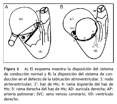 Para explicar por qué en el electrocardiograma el eje se encuentra desviado a la izquierda debemos recordar que el nodo atrioventricular normalmente se localiza en el vértice del triángulo de Koch. El haz de His discurre encima del anillo fibroso de la valva septal de la tricúspide y al llegar al septum membranoso cursa por su borde poster o inferior hasta que se divide en 2 ramas: la derecha que baja por la trabécula septomarginal y la izquierda que perfora el septum membranoso y desciende por la superficie izquierda del tabique interventricular (fig. 6A). En el defecto de la tabicación atrioventricular no hay triángulo de Koch. El nodo atrioventricular se sitúa debajo de la desembocadura del seno coronario, por lo que tiene desplazamiento posterior respecto a lo normal. El haz de His se sitúa en el borde de la comunicación interventricular de entrada por lo que está desplazado en sentido posteroinferior6 (fig. 6B).