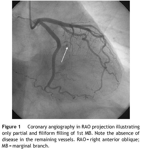 A 52-year-old woman, without history of heart disease or risk factors was admitted in the Coronary Care Unit (CCU) with an acute myocardial infarction and immediately transferred to the Cath Lab for primary angioplasty. Coronary angiography revealed a complete occlusion of the first marginal branch without evidence of atheromatosis in the remaining vessels (Fig. 1). After beginning anticoagulation with unfractioned IV heparina6FrEBU 3.5 (Medtronic, Inc.) guiding catheter was positioned in the left ostium. A 0.014in. Choice® Floppy guidewire (Boston Scientific) was advanced with some difficulty through the occluded vessel and a 2.5 mm x 20 mm Maverick® balloon (Boston Scientific) was inflated with only partial restoration of the lumen and incomplete distal filling. An Atlantis® SR Pro (Boston Scientific) intravascular ultrasound catheter (IVUS) was advanced and a long dissection extending from the ostium to the distal part of the artery was observed (Fig. 2). In that moment two PROMUS® (Everolimus-Eluting Coronary Stent, Boston Scientific) stents, 2.25mm x 24mm and the second one of 2.25 mm x 16 mm were deployed with 1 mm overlapping between them, thus completely covering the long dissection and restoring normal flow (Fig. 3A-F).