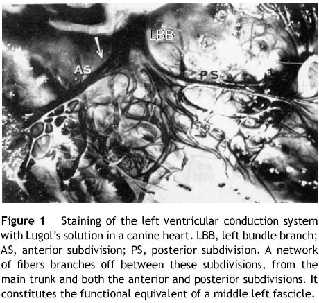 The atrioventricular conduction system originates in the AV node with the bundle of His. The bundle of His was described by the Swiss doctor, Wilhelm His Jr. (1863-1934) and comprises the common trunk and the left and right ventricular systems.11 The first, evidenced by Sunao Tawara, using his-tological staining with Chinese ink in the human heart and several animal species, has been localized in recent times by different staining methods. In the canine heart, the bundle is evidenced using iodine-potassium iodide solution (Lugol's solution), because the specialized tissue it contains is very rich in glycogen that has high affinity for iodine. This system can also be stained by Lugol's solution in the human heart.