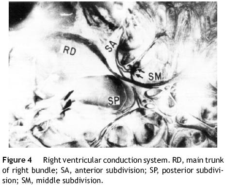 Se presentan asimismo, de forma esquemática, los sistemas de conducción ventricular izquierdo y derecho, que comprenden el tronco principal y las subdivisiones periféricas con sus respectivas redes de Purkinje. Respecto a la controvertida existencia de un fascículo izquierdo medio, éste sí puede existir en corazones humanos y de animales. Pero la red septal intermedia de fibras especializadas parece ser un equivalente funcional de dicho fascículo.