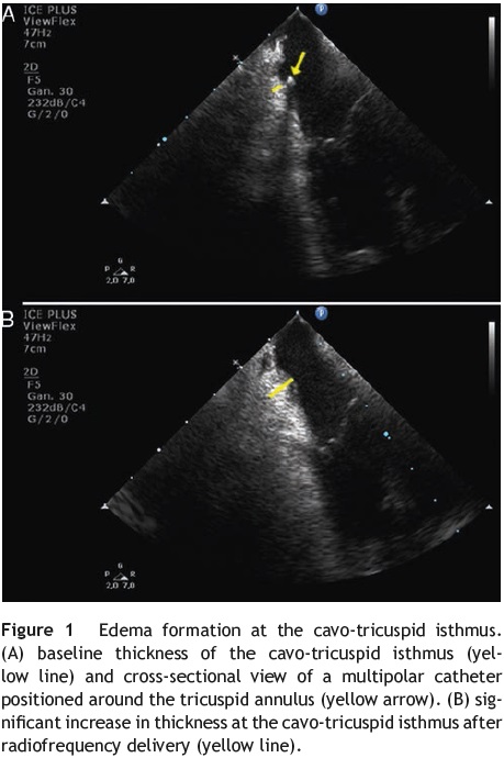 In the present report we show a striking image of edema formation during radiofrequency delivery at the cavo-tricuspid isthmus in a patient who underwent common atrial flutter ablation using real-time monitoring by intracardiac echocardiography. Fig. 1 shows the baseline thickness of the isthmus before radiofrequency delivery (panel A, yellow line). The yellow arrow points the transversal section of the multipolar catheter positioned around the tricuspid annulus. Complete conduction blockage through the isthmus was challenging despite the use of 8-mm non-irrigated-tip catheter and progressive increase in generator power up to 90 W. Isthmus blockade was achieved after 832 s of radiofrequency delivery. In Fig. 1, panel B, we show a significant increase in the thickness of the isthmus at the end of the procedure (Yellow line), and no complications were present. However, we postulate that the use of intracardiac echocardiography may help to decide when to stop the ablation procedure and postpone it for a second procedure in two weeks, upon resolution of the acute edema. Such an approach might avoid the above-mentioned severe potential complications due to deeper lesions and higher chances of right coronary artery damage. In addition, remaining conduction gaps might be easily identified and ablated after edema disappears. Therefore, it might be reasonable to use an intracardiac echocardiography probe in difficult ablation procedures after multiple ablation lesions and long radiofrequency delivery time.
