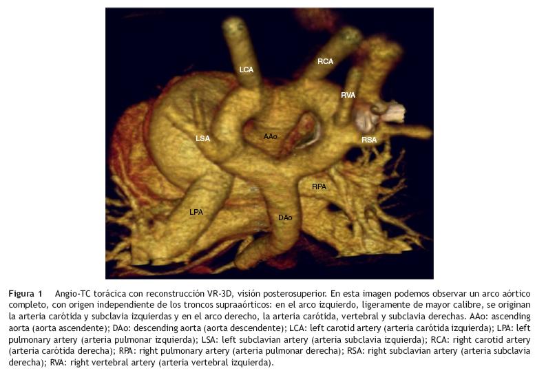 Se expone el caso de una niña de 5 años de edad que presenta un cuadro malformativo compatible con síndrome de Rubinstein-Taybi (RTS). Se la remite al cardiólogo para valoración por soplo sistólico sin otra sintomatología. A la exploración física se encontraba: talla en percentil 5, fenotipo con pulgares gruesos así como soplo holosistólico en mesocardio ll-Vl, pulsos normales. FISH positivo para deleción del cromosoma 16p13.3. En el estudio ecocardiográfico se detectó una comunicación interventricular perimembranosa pequeña con mecanismos de cierre, presión pulmonar normal, pero en los planos de grandes vasos se visualizaron 2 arcos aórticos bien desarrollados. Tras el diagnóstico de doble arco aórtico y sin que la paciente tuviera ninguna sintomatología respiratoria ni digestiva se realizó un estudio completo con esofagograma que mostraba compresión extrínseca y una fibrobroncoscopia que revelaba una traqueomalacia leve y compresión extrínseca traqueal por doble arco aórtico y lobulación pulmonar anormal. Se realizó un cateterismo cardiaco que confirmó los hallazgos previos.