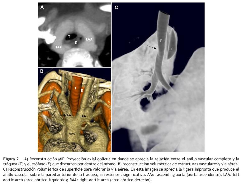 La niña fue remitida a nuestro centro para tratamiento quirúrgico. Debido a la ausencia de sintomatología se realizó una TAC multicorte que mostró un anillo vascular completo con doble arco aórtico, con ligera asimetría en el calibre de los arcos siendo el izquierdo ligeramente de mayor calibre. (fig. 1). No se observó ninguna compresión significativa de la vía aérea (fig. 2) y dada la ausencia de síntomas no se realizó intervención quirúrgica.
