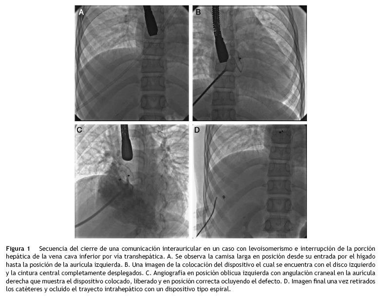 En casos especiales, como en los de levoisomerismo con interrupción de la vena cava inferior intrahepática, se puede realizar el procedimiento sin problema aunque la vía de acceso no sea femoral. En estos casos, con acceso femoral ausente, como ocurrió en 2 de nuestros pacientes, se recomienda el acceso por vía transhepática, realizado sin mayores dificultades (fig. 1). No mencionaremos las ventajas encontradas con respecto a la cirugía, ya que eso ha sido motivo de un estudio publicado previamente29; solo recordar que, aun cuando la tasa de morbilidad fuera la misma, el tiempo de estancia hospitalaria es más corto, no se requiere la administración de hemoderivados, el tiempo de anestesia es menor, y se evita el dolor y la cicatriz de la esternotomía.