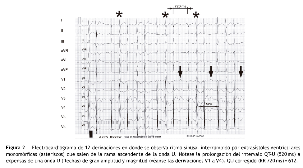 Un dato común en los pacientes con ATS es la presencia de un intervalo QT-U largo (fig. 2), con un patrón característico T-U el cual incluye onda U prolongada, intervalo T-U amplio y onda T terminal prolongada con un declive característico para ATS1 en comparación con los otros SQTL28.