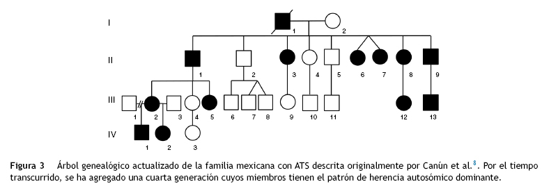 Mediante un estudio de «análisis de ligamiento» con 400 marcadores polimórficos en el genoma de 15 individuos con ATS, Plaster et al.9 identificaron que la región candidata se localizaba en el locus 17q23 por medio del marcador D17S949 10, obteniendo un lod = 3.23 y theta = 0.0. Como en este locus se encuentra un gen que codifica para un canal de potasio, el KCNJ2, decidieron estudiarlo, identificando la mutación D71V en la familia mexicana informada previamente por Canún et al.8. Esta mutación tiene un efecto dominante negativo y corresponde a una transversión (cambio de adenina por timina) en el nucleótido 440 que resulta en un cambio en el dominio aminoterminal en la última posición de una alfa-hélice; este residuo es apenas distal al dominio putativo de interacción N-terminal11,12.