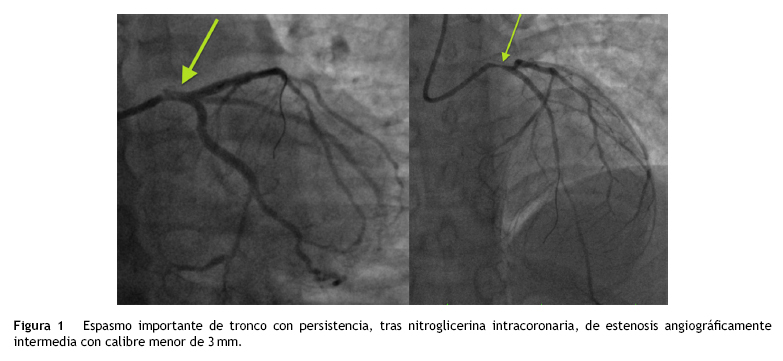 En esta ocasión acude por angina de esfuerzo de 2 meses de evolución; con ergometría (prueba de esfuerzo físico) clínica y eléctricamente positiva en forma temprana (estadio 1 del protocolo de Bruce) y una fracción de expulsión del ventrículo izquierdo del 52% con hipocinesia anterior ligera. En el cateterismo cardiaco se aprecia tronco coronario izquierdo con imagen sugerente de espasmo pero persistiendo lesión angiográficamente intermedia después de la administración de nitroglicerina (fig. 1) y coronaria derecha de escaso calibre, subocluida a nivel proximal; se realiza ecografía intravascular sobre la lesión del tronco coronario, comprobándose estenosis importante de predominio fibrótico con área luminal mínima de 3.6 cm2 (fig. 2). Tras discutirse en sesión clínica se opta por revascularización quirúrgica; sin embargo, estando la paciente ingresada en espera de la intervención sufre paro cardiorrespiratorio con asistolia que no respondió a las medidas de reanimación cardiopulmonar por lo que termina falleciendo.