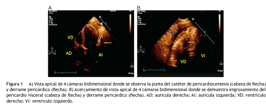 Mujer de 55 años con diabetes tipo 2 tratada con hipoglucemiantes por vía oral. Cuatro años antes se le diagnosticó artritis reumatoide (AR) y recibió metotrexato. Este se suspendió 2 meses antes de su ingreso. Inicia su padecimiento con aumento progresivo del perímetro abdominal, edema en miembros inferiores y disnea de medianos esfuerzos que progresó hasta ortopnea y disnea paroxística nocturnas. Acudió a recibir atención médica a su hospital general de zona en Tapachula Chiapas, donde se detectó por ecocardiografía derrame pericárdico y fue referida a nuestra unidad. Ingresó en urgencias del hospital de cardiología con presión arterial de 80/60 mmHg, frecuencia cardiaca de 150 ppm, frecuencia respiratoria de 24 rpm, y saturación de oxígeno del 92%. A la exploración física se encontró paciente neurológicamente íntegra, con palidez generalizada de tegumentos, regular estado de hidratación, signo de Kussmaul positivo, los ruidos cardiacos disminuidos en intensidad y aumentados en frecuencia, sin soplos. Los campos pulmonares estaban ventilados sin estertores, en el abdomen reflujo hepatoyugular presente. Las extremidades sin edema. El ecocardiograma transtorácico demostró derrame pericárdico de 1,200 cc sin otra enfermedad asociada. Se realizó pericardiocentesis y se drenaron 1,200 cc de líquido amarillento con pH de 9, proteínas totales 4.5 g/d, DHL 515 UI/L, sin leucocitos. El cultivo bacteriano fue negativo. Las pruebas de laboratorio mostraron glucosa 155 mg/dL, urea 14 mg/dL, creatinina 0.7 mg/dL, sodio 110 mol/L, potasio 4 mmol/L, cloro 69 mmol/L, proteínas totales 7.3 g/dL, globulinas 4.2 g/dL, albumina 3.1 g/dL, ALT 27 UI/L, AST 25 UI/L, amilasa 36 UI/L, DHL 214 UI/L, y colesterol total 320 mg/dL. La biometría hemática sin alteraciones con Hb 12.5 g/dL, hematocrito 36%, plaquetas 195 mil/mcL, leucocitos 12.6 mil/mcL.