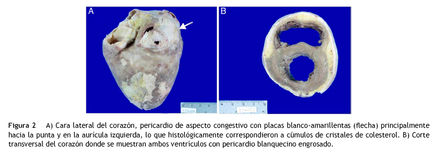 Lo más común es que macroscópicamente el líquido pericárdico sea amarillo brillante. Las capas del pericardio tienen diversos grosores y adherencia; algunas veces con parches que corresponden a la acumulación de células espumosas. Se han descrito varios grados de infiltración por mononucleares, células plasmáticas y son frecuentes los granulomas de células gigantes con cuerpos extraños. El estudio microscópico del líquido puede mostrar cristales de colesterol con placas romboideas y con esquinas cortadas11.