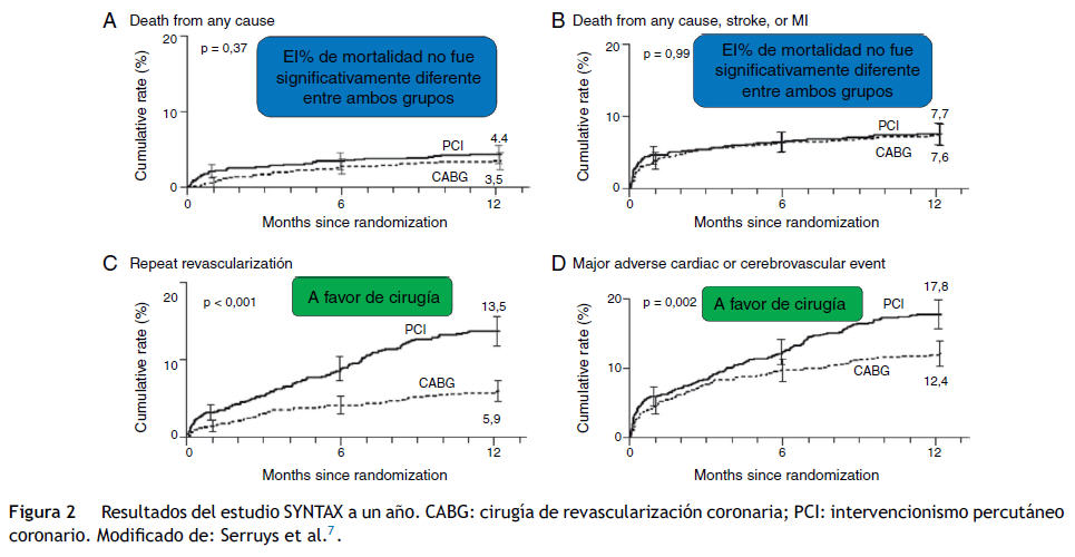 En esta primera publicación del estudio SYNTAX de los resultados a un año se puede concluir lo siguiente: en relación con la variable principal, MACCE a un año, la cirugía probó ser superior en comparación con el intervencionismo. Los hallazgos relacionados con los componentes de la variable principal y con los subgrupos de análisis son meramente observacionales y generadores de hipótesis.
