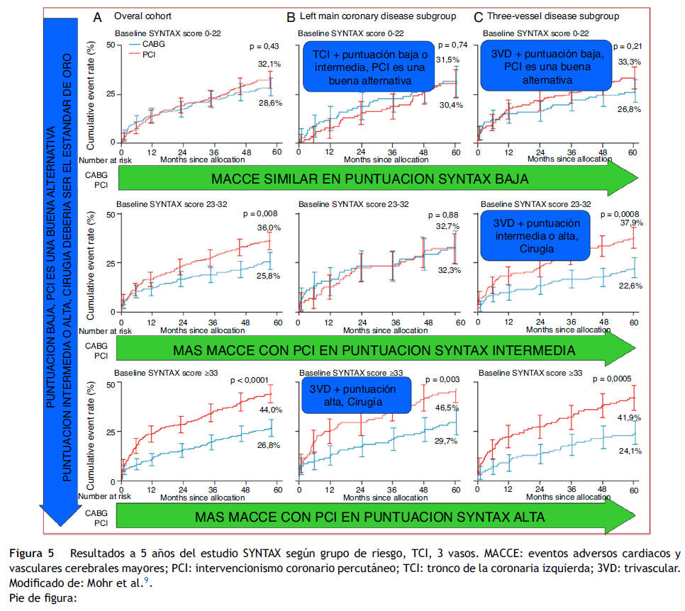 En cuanto a la puntuación Syntax, diseñada para predecir resultados en relación con las características anatómicas, en esta primera publicación se puede concluir que fue predictiva de resultados en el caso de los pacientes que fueron sometidos a intervencionismo coronario, en particular aquellos pacientes del grupo de puntuación elevada, no solo en los resultados de MACCE sino también de los componentes del conjunto de mortalidad, enfermedad vascular cerebral e infarto de miocardio. Esto sugiere que se debe evitar realizar intervencionismo coronario en pacientes de puntuación Syntax elevada. Por el contrario, los resultados quirúrgicos no fueron influidos por esta.
