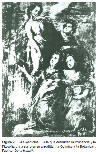 En conclusión, lo aquí relatado demuestra claramente la pluralidad y la continuidad, a través de los siglos, de las corrientes de pensamiento que fluían entre el viejo y el nuevo mundo. Tales intercambios de ideas y conocimientos evidencian el interés siempre vivo de elementos novohispanos selectos para los extensos y fascinantes dominios de la cardioangiología. Por lo que toca al valor que se le reconocía a la botánica y a la química, como ciencias auxiliares de la medicina, puede mencionarse la presencia de la versión española del tomo I del Tratado elemental de química de A. L. Lavoisier. Esta fue efectuada probablemente por el botánico Vicente Cervantes y destinada a los alumnos del Colegio de Minería (fig. 1). Y también una pintura alegórica de fines del siglo XVIII. Se trata de Almacén (fig. 2), conjunto de varias tablas que servían de puertas a un gran almacén para guardar los tarros de especias, minerales en polvo, sales y toda clase de medicamentos, en la botica poblana de Ignacio Rodríguez Alconedo. El cuadro fue pintado por el artista poblano Miguel Jerónimo Zendejas en 1797. Lo describe cuidadosamente don Francisco de la Maza y concluye con la aseveración de que la obra es «una gran pintura de aquel movimiento de ideas tan necesario, tan optimista y feliz, que fue el padre intelectual del siglo XIX y se llamó 'La Ilustración'18.