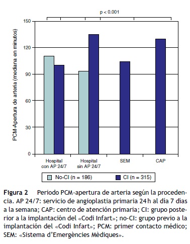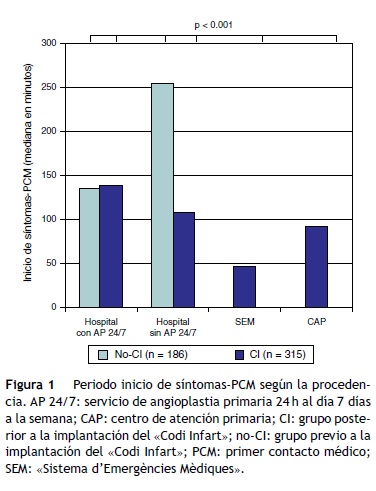 En nuestro estudio se observa cómo tras la implantación del CI se produjo una drástica reducción del tiempo total de isquemia (inicio de síntomas-apertura de arteria) (220 min vs. 272 minu, p = 0.003). Esto se produjo principalmente a expensas de un reducción en el intervalo inicio de síntomas-PCM (90 min vs. 152 min, p < 0.001), ya que el intervalo PCM-apertura de arteria presentó un pequeño incremento (120 min vs. 106 min, p < 0.001).