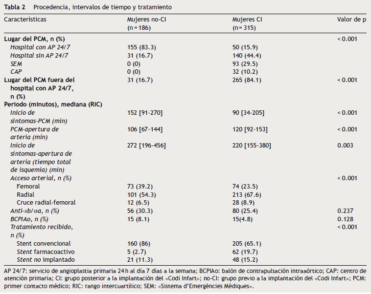 Método: Las mujeres referidas para angioplastia primaria se dividieron en 2 grupos de acuerdo con el Codi Infart: grupo no-Codi Infart (enero de 2003 a mayo de 2009) y grupo Codi Infart (junio de 2009 a diciembre de 2012); y se compararon lugar de procedencia, periodos, tratamientos recibidos y tasa de eventos cardiovasculares mayores definida como muerte por todas las causas, reinfarto o accidente cerebrovascular durante el ingreso, a 30 y 180 días.