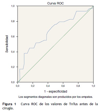 En algunas variables, como el valor de TnTus en el preoperatorio, se determinó un punto de corte mediante la creación de curvas ROC que permitió aumentar la rentabilidad del estudio de regresión.