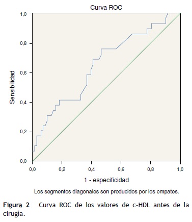 El análisis mediante curva ROC de los valores de colesterol HDL (c-HDL) en el preoperatorio mostró asociación con la aparición de FA postoperatoria (fig. 2). El área bajo la curva fue de 0.67 (0.55-0.79) con valor de p = 0.007. El mejor punto de corte fue 38.26 mg/dl con una sensibilidad del 76% y una especificidad del 50%.