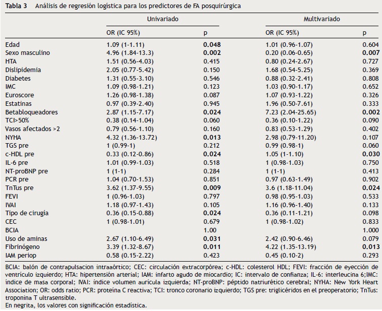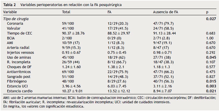 Resultados: Se incluyeron un total de 100 pacientes sometidos a cirugía de revascularización coronaria (59) o sustitución valvular aórtica (41) por estenosis aórtica grave. La FA postoperatoria se produjo en 29 pacientes con predominio de la cirugía valvular respecto a la cirugía coronaria. Los factores predictivos de la aparición de FA postoperatoria en el análisis multivariable fueron el sexo masculino, la ausencia de terapia crónica con betabloqueadores, la perfusión de fibrinógeno intraoperatorio, valores bajos de colesterol HDL y valores elevados de troponina T ultrasensible en el preoperatorio.