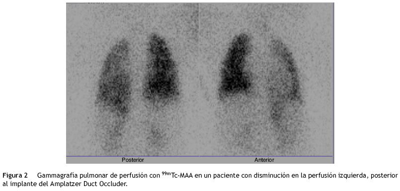 Describimos el efecto del dispositivo Amplatzer Duct Occluder (ADO) en la obstrucción del origen de la API y la perfusión pulmonar izquierda, utilizando la gammagrafía pulmonar de perfusión.