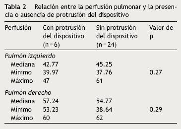 La ecocardiografía Doppler postimplante del ADO evidenció 5 pacientes (16.6%) con incremento en la Vmáx en la API (excluyendo al paciente con estenosis preimplante) con valores entre 1.7-2.2 m/s (gradiente 11-19 mmHg) y con una disminución leve del flujo pulmonar (37-39%) en 3 de ellos (p = 0.09). Seis pacientes (20%) evidenciaron protrusión del dispositivo hacia la API, con un gradiente > 10 mmHg en 5 de ellos. Al comparar el resultado de la perfusión pulmonar entre los pacientes con y sin protrusión del dispositivo, no hubo diferencia estadísticamente significativa (tabla 2).