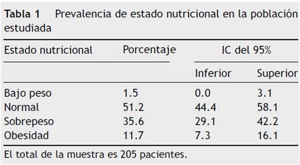 El 51.2% (IC del 95%, 44.4-58.1) de la población se ubica en el estrato nutricional normal y el 35.6% (IC del 95%, 29.1- 42.2) en el estrato sobrepeso (tabla 1).