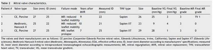 Implantation was successful in all patients, 2 patients received transseptal implantation with an Edwards Sapien XT (Edwards Lifesciences, Irvine, California) valve (#23 and #29) and 1 patient transapical implantation with an Edwards Sapien (Edwards Lifesciences, Irvine, California) #26 valve into a degenerated bioprosthesis (range 24---29 mm) in mitral position. Ecocardiography showed a reduction of mean transvalvular gradients from 18.5 ± 9.5 mm Hg to 3 ± 1 mm Hg, with no paravalvular regurgitation remaining, the systolic pulmonary artery pressure (SPAP) had a reduction from 92.5 ± 12.5 mm Hg to 50 ± 10 mm Hg (Table 2). One patient with the transseptal approach developed a hospital acquired pneumonia and sepsis, then evolves into a septic shock and died 10 days after the procedure. In the remaining patients the New York Heart Association (NYHA) functional class improved from 3.0 to 1.0, over a mean follow-up of 227 (IQR: 90---365) days.