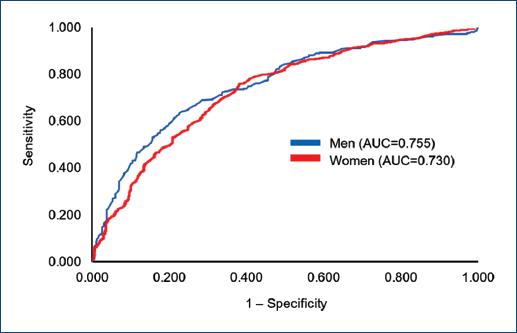 To determine the WC associated with ≥2 cardiometabolic alterations, the AUC was 0.75 (95% CI; 0.73-0.78) in men and 0.73 (95% CI; 0.71-0.76) in women (Fig. 2), corresponding to a probability around 74% to detect subjects with ≥2 alterations. Using the best tradeoff between sensitivity and specificity, a cutoff value of 90 cm in men (sensitivity = 72.4% and specificity = 66.1%) and 86 cm in women (sensitivity= 76.2% and specificity = 61.4%) were optimal for aggregation of ≥ 2 alternations in Venezuelan adults (Table 2).