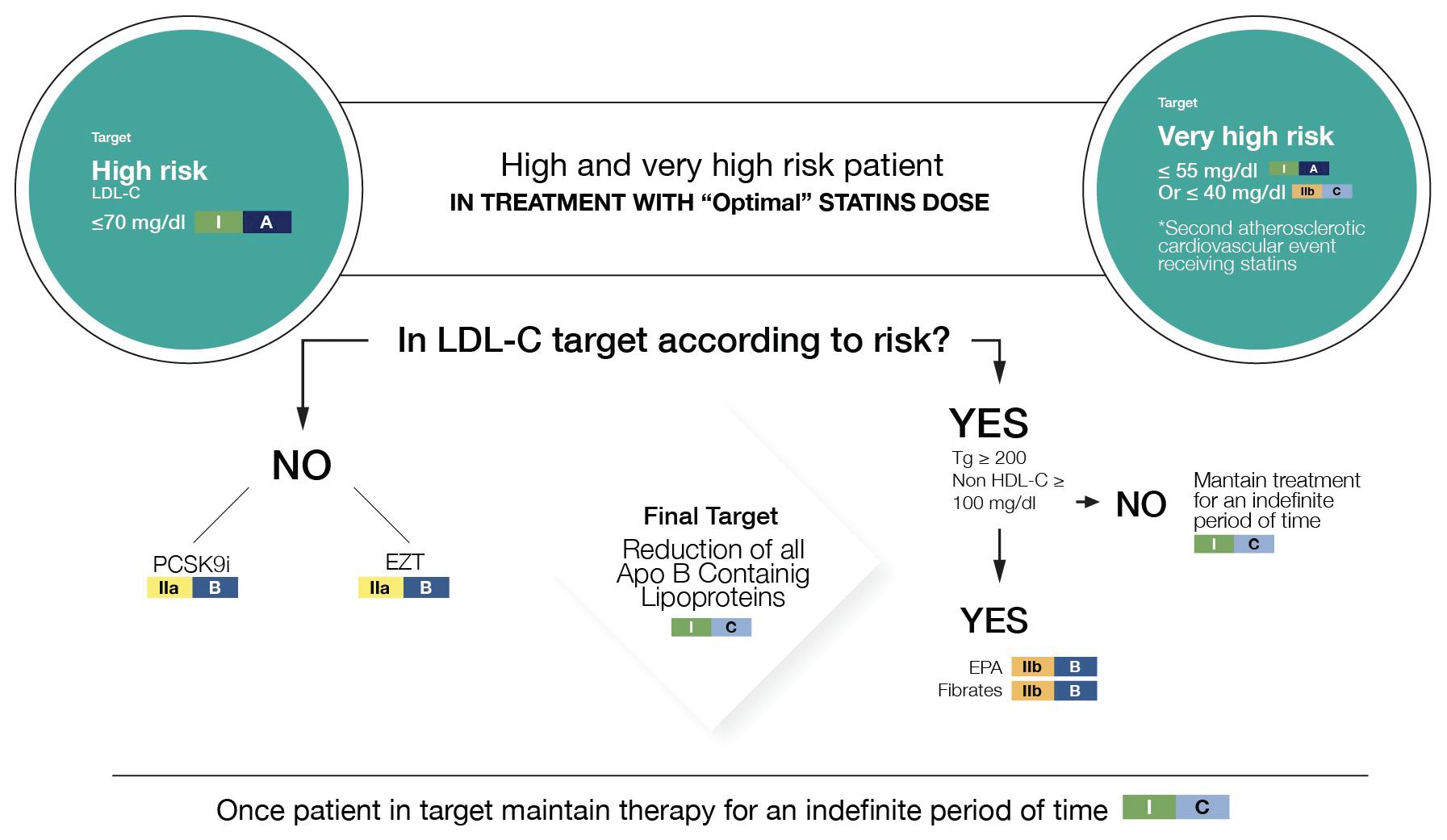 In patients with an LDL-C > 55% above the goal, EZT could be in the initial combination (IIbC), or as a second-line adjuvant therapy following high dose potent statins and failing to accomplish the LDL-C goal (IIaB).