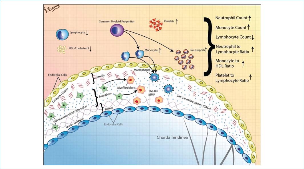 As known from the previous studies, HDL-C has anti-inflammatory effects, stimulates nitric oxide, and promotes angiogenesis18,19. Chang et al. detected decreased HDL-C in valvular heart disease, which is consistent with our results20. We found lower HDL-C, and higher TG and LDL-C levels in the MVP group and these findings were consistent with earlier studies21,22. A possible explanation may be that TG-rich lipoproteins and LDL-C may promote an inflammatory response causing upregulation of TGF-b and metalloproteinase levels23, and in the end result in valve degeneration. TGF-b is an essential factor for developing cardiac and valvular fibrosis. Monocyte reproduction is promoted by TGF-b in non-syndromic MVP24 and infiltrated monocytes turn into macrophages provoking myxomatous degeneration25. In our study, monocytes were higher in the MVP group, but this was not statistically significant. Furthermore, platelet counts were higher in our MVP patients. This result may be explained by the fact that inflammatory mediators stimulate megakaryocytic proliferation and lead to relative thrombocytosis. Although endothelial deformation of the valve surface plays a role in platelet dysfunction, it can cause overexpression, especially in mitral regurgitation26.