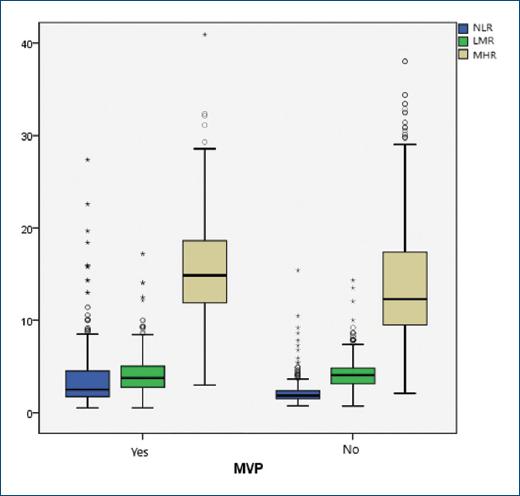 MVP is a multifactorial valvular disease caused by myxomatous degeneration of valvular tissue. Myxomatous changes are defined as the expansion of the middle spongiosa layer of the valve (due to accumulation of proteoglycans), structural alterations of collagen in all components of the leaflet, and by structurally abnormal chordae4,5. This process is triggered by valvular interstitial cell transformation. In general circumstances, it is inactively deployed in the spongiosa layer. Structural cells change into myofibroblasts and macrophages for unknown reasons6. Inflammation may play a role in this process, but it’s not known currently. Some new inflammatory markers have been identified in recent years and an association has been found with many cardiovascular diseases7-10. These inflammatory markers, obtained simply from a complete blood count (CBC), were evaluated to provide useful information for many different diseases and conditions. Although some research has been carried out on elevation of new inflammatory markers in valvular heart diseases11-13, no studies evaluating markers such as monocyte-to-high-density lipoprotein (HDL) ratio (MHR), lymphocyte-to-monocyte ratio (LMR), neutrophil-to-lymphocyte ratio (NLR), and platelet-to-neutrophil ratio (PLR) in MVP patients. In this study, we aimed to investigate the above-mentioned inflammatory marker levels in MVP patients.