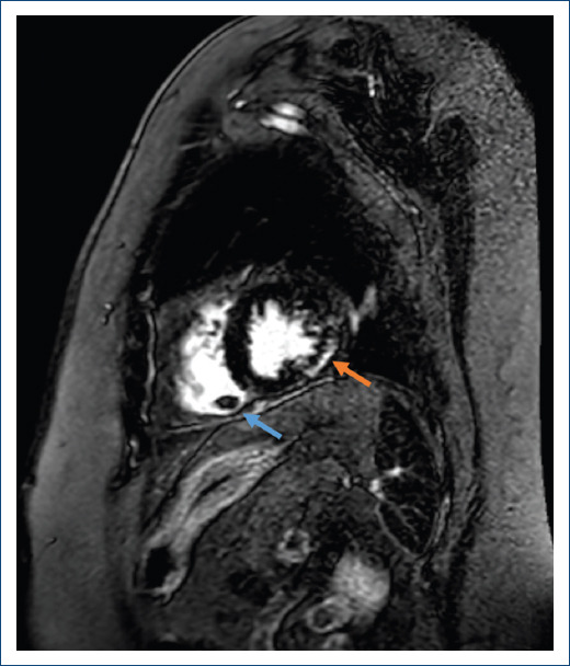 Figure 1 CMRI. Short axis. Inversion-recovery sequence. Late gadolinium enhancement in inferolateral wall (red arrow). Aneurysm in the right ventricle containing a rounded thrombus (blue arrow).