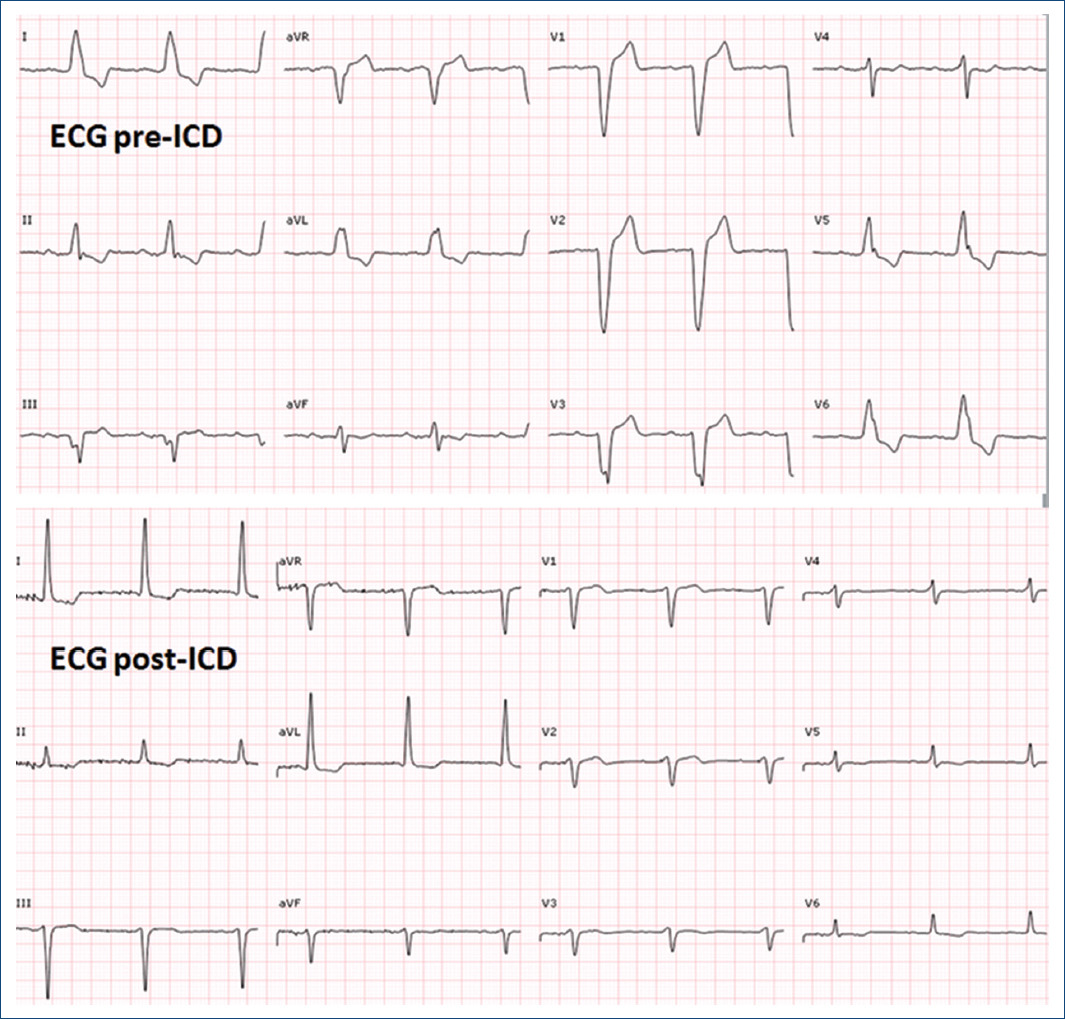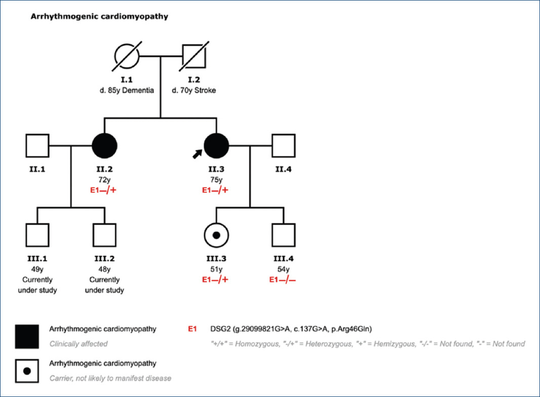 Due to the clinical suspicion of biventricular arrhythmogenic cardiomyopathy with sustained ventricular arrhythmias, cardioverter-defibrillator (ICD) implantation was decided. Subcutaneous approach, initially preferred due to persistent thrombus, was finally dismissed due to predicted high risk of inappropriate therapies in the screening test. Finally, a transvenous ICD was implanted with defibrillation electrode located in the posterior interventricular vein and left bundle branch pacing (Fig. 2) with a significant reduction of paced QRS duration (Fig. 3) and partial recovery of biventricular function during the follow-up. Subsequently, a genetic study was performed confirming a pathogenic variant in the DSG2 gene, which not only explained the phenotype but also allowed familiar cascade screening (Fig. 4).
