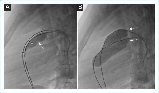 Figura 2 Secuencia fluoroscópica en proyección lateral izquierda que demuestra valvuloplastia pulmonar con técnica de doble balón en uno de nuestros pacientes. A: se muestran dos balones atravesando la válvula pulmonar, solo uno de ellos iniciando insuflación (*); nótese la formación de una cintura en su cara posterior (flecha) que corresponde al anillo valvular pulmonar. B: se muestra la insuflación total de los dos balones (flechas); nótese la desaparición de la cintura previamente descrita al lograr la dilatación del anillo pulmonar.