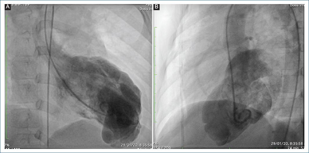 Figura 1 A: ventriculografía que muestra un aneurisma en el ápex cardiaco. B: vista lateral del aneurisma.