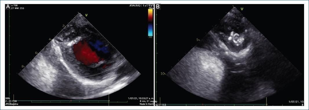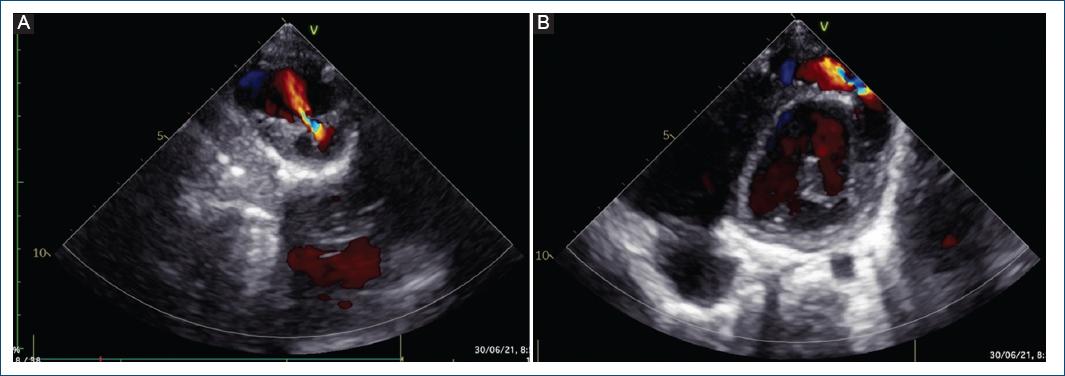 Figura 4 Ecocardiografía transtorácica. A: eje corto paraesternal, con evidencia de fuga residual en el parche de pericardio. B: eje apical de cuatro cámaras mirando al ápex, con evidencia de fuga residual.