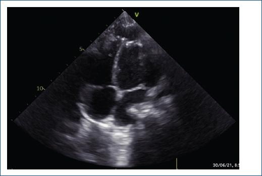 Se realizó RM, en la cual fue posible visualizar el parche en el ápex comunicando con la bolsa apical residual de 25 × 15 mm, con flujo bidireccional en su interior; la zona de comunicación era anterolateral y medía 4 × 3.5 mm. La función sistólica del ventrículo izquierdo estaba levemente disminuida, incluyendo la bosal apical que tenía flujo. La FEVI era del 44% y la fracción de eyección del ventrículo derecho del 57%.