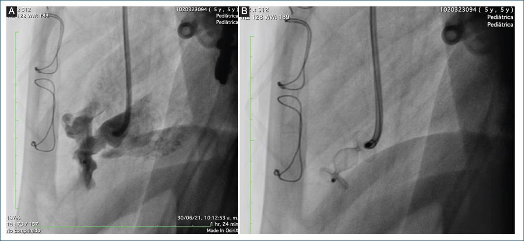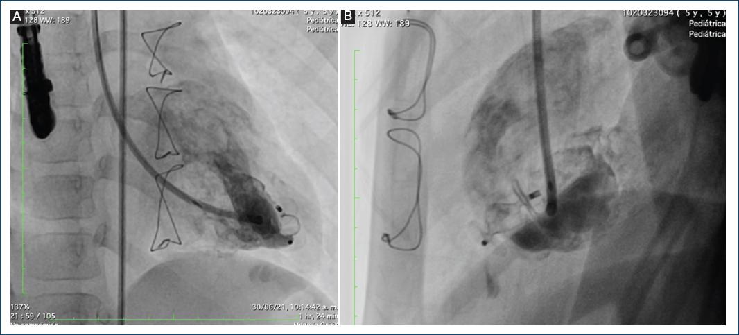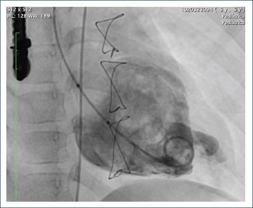 A los 3 años de vida se realizaron imágenes de control con RM, encontrando el AVI conocido comprometiendo la pared septal del ventrículo izquierdo, con diámetro de 16 × 11 mm, con adelgazamiento de la pared miocárdica e hipocinesia en esta región, sin comunicación con el ventrículo derecho. El ecocardiograma mostró función ventricular izquierda conservada, con fracción de eyección del ventrículo izquierdo (FEVI) del 63%, sin dilatación del ventrículo izquierdo, y aneurisma apical de 16 × 15 mm de diámetro. Con estos resultados, se decidió realizar estudio hemodinámico, en el cual se observó un ventrículo de morfología izquierda posterior, con segmento apical con divertículo gigante, con trabéculas en su interior e hipocinesia asociada. La diferenciación angiográfica entre aneurisma y divertículo es difícil, requiriendo para su correcta caracterización un estudio histológico. Sin embargo, al presentar una disminución progresiva de la FEVI hasta el 50%, se decidió llevar al paciente a corrección quirúrgica del aneurisma o del divertículo.