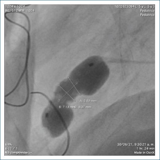 Figura 6 Medidas del balón y decisión de implantación de un dispositivo Amplatzer Vascular Plug, teniendo en cuenta la necesidad de un dispositivo con cintura por la configuración de la lesión en túnel.