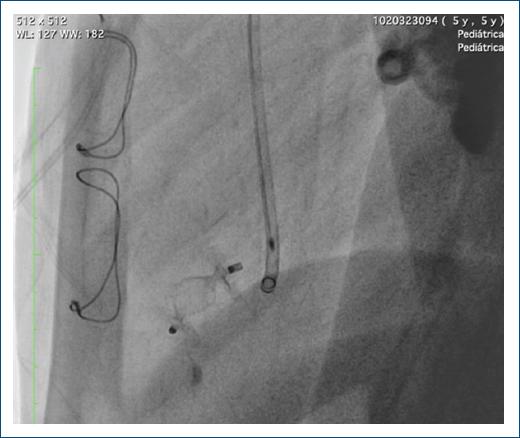 Se llevó de nuevo el caso a junta médico-quirúrgica, donde se consideró el cierre del defecto por vía endovascular (Fig. 5). Para ello, se avanzó una guía hidrófila dentro del divertículo y sobre esta se pasó un catéter non taper hasta el cuerpo del divertículo. Se realizó angiografía en proyecciones oblicua derecha y lateral, observando el gran divertículo con un boca proximal tipo túnel.