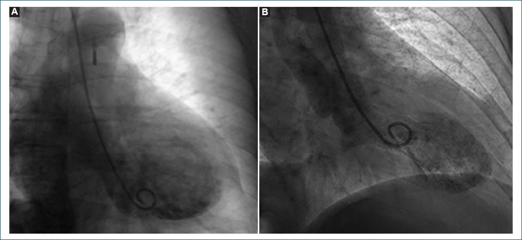 Figure 1 Left ventriculography A: during diastole and B: systole showing typical left ventricular apical ballooning.