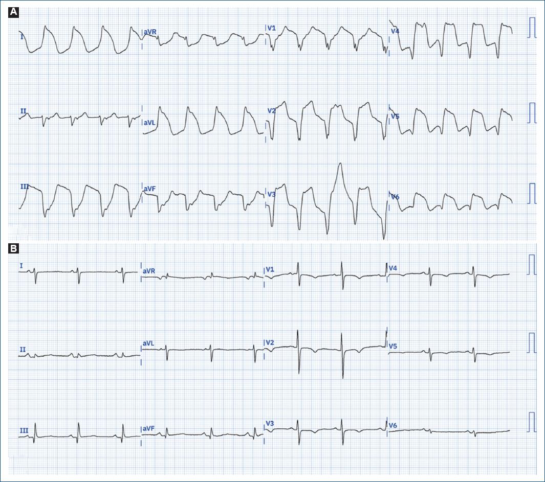 Figure 2 ECG. A: initial ECG on arrival to the enforcement directorate showing a wide QRS complex, diffuse ST-segment elevation, and a prolonged corrected (Bazett) QT interval of 560 mseg. B: ECG on day 3 which shows sinus rhythm with abrupt QRS and QT interval normalization corresponding with normalized calcium. ECG: electrocardiogram; QRS: QRS complex.