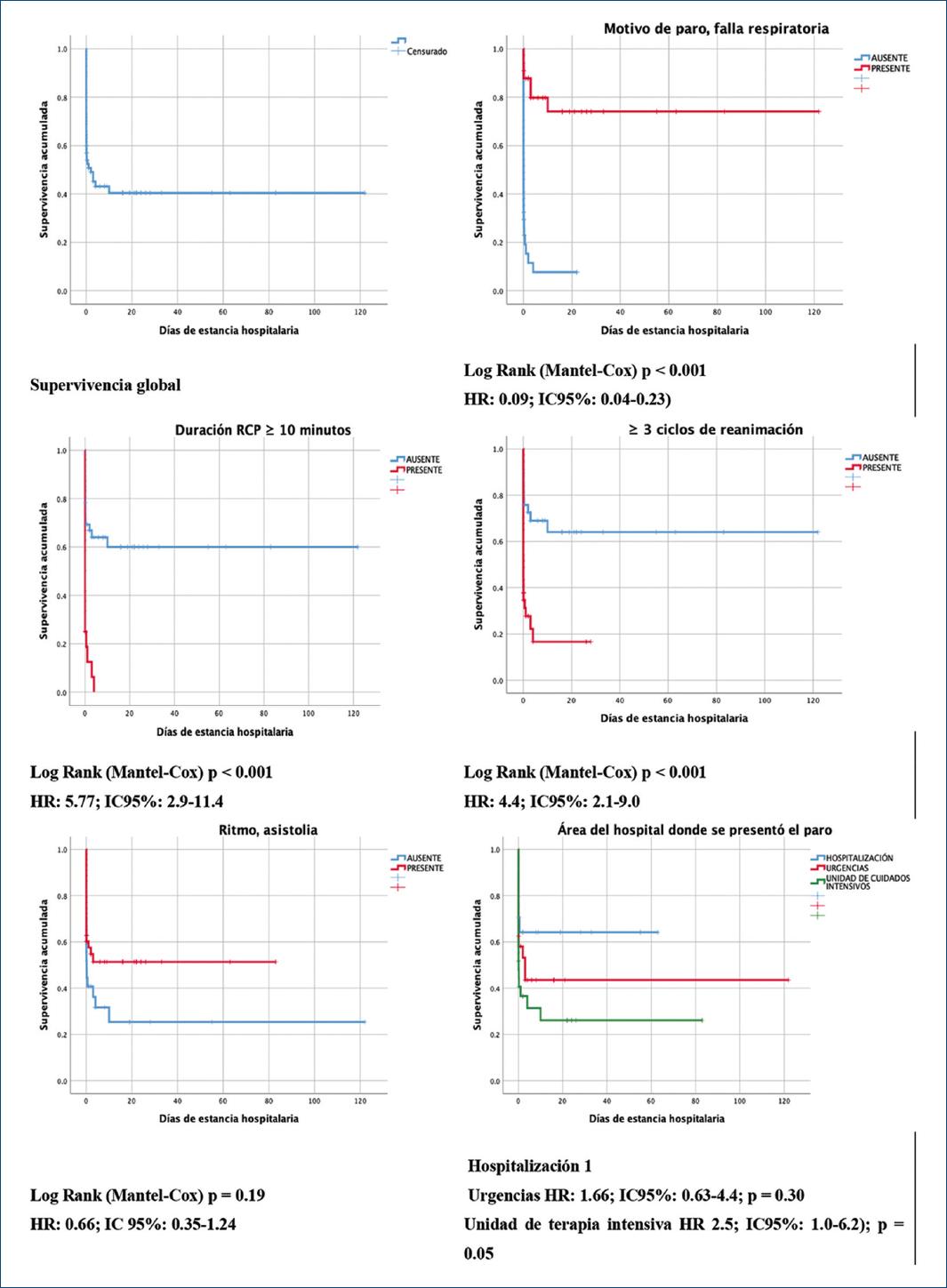 Se sometieron a análisis multivariado los factores que se enlistan en la figura 1 y se observó que mostraron asociación independiente con defunción la falla respiratoria (HR: 0.92; IC95%: 0.03-0.25) y recibir ≥ 3 ciclos de reanimación (HR: 3.38; IC95%: 1.09-10.5).