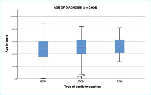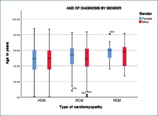 There are no significant differences in age at the time of inclusion in the database. However, differences in the age of diagnosis are evident, with a lower age in patients with HCM and a higher age in patients with RCM (Fig. 1). No differences in the age of diagnosis are observed between men and women in all three groups (Fig. 2).