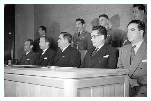 Figura 4 Presidium durante la inauguración del Instituto Nacional de Cardiología. De izquierda a derecha: Dr. Salvador Zubirán, subsecretario de Asistencia; Dr. Gustavo Baz, secretario de Salubridad y Asistencia; general Manuel Ávila Camacho, presidente de la República; Dr. Manuel Martínez Báez, subsecretario de Salubridad y Dr. Octavio Mondragón, oficial mayor. Propiedad de la Secretaría de Cultura. INAH. SINAFO F.N. MEX. (reproducción autorizada por el Instituto Nacional de Antropología e Historia).